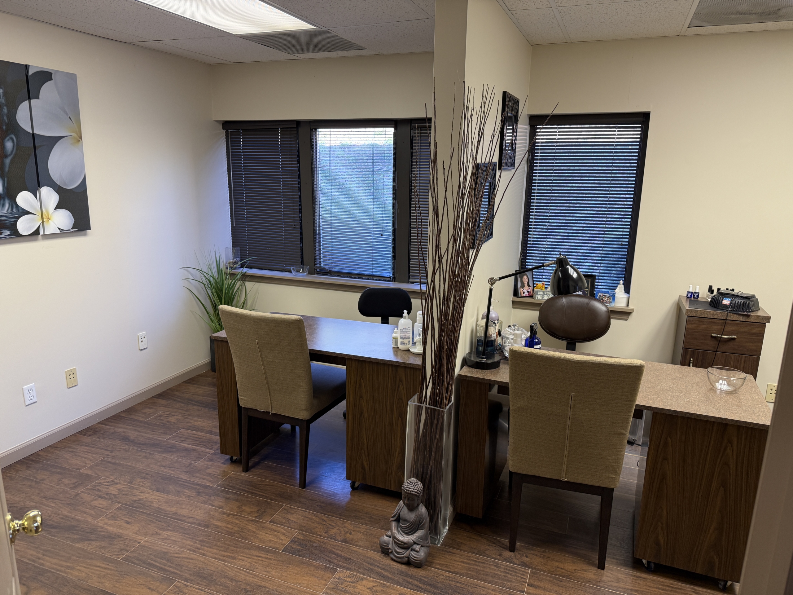 A well-established spa/salon location with over 20 years of continuous success is now partially available for lease! One of the building’s long-term tenants—a respected stylist offering hair and nail services—will be retaining half of the space. The other 1,550 square feet are now available for complementary beauty, spa, and wellness services.