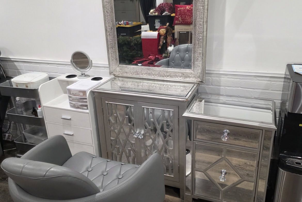 Premium station setup: mirror + chair + cabinet