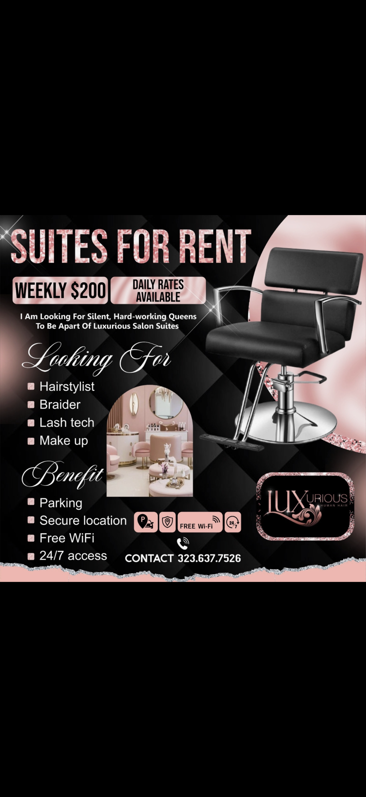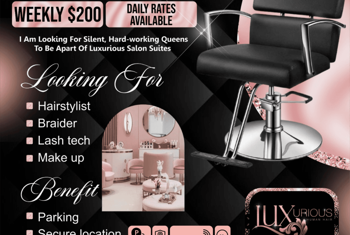 looking for a make up artist, hairstylist, and lash tech who’s looking for salon suites to rent for 200 a week