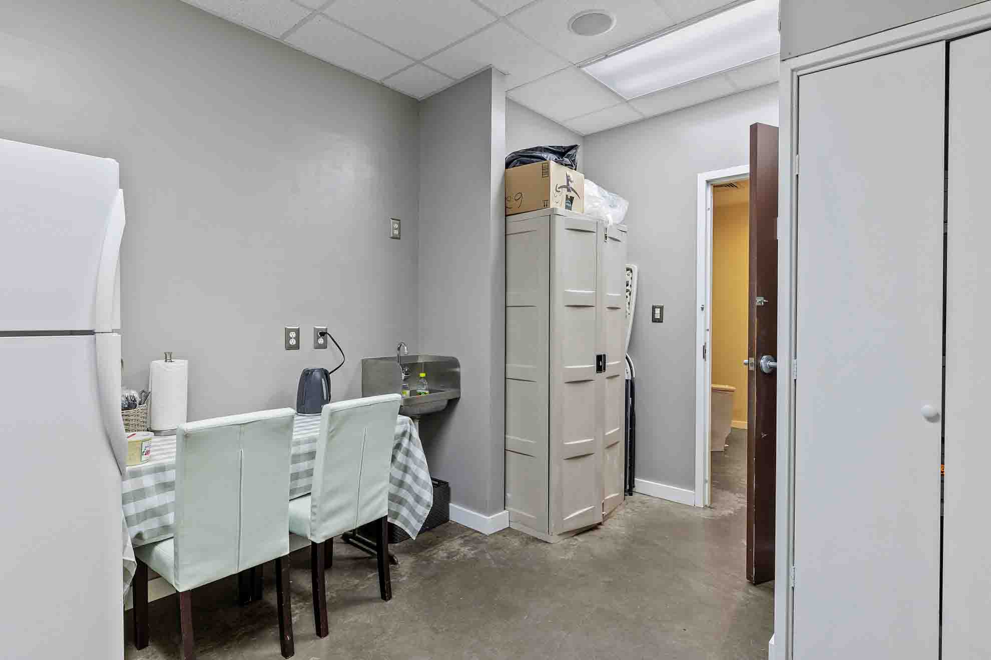 – Convenient Break Room – A comfortable and convenient break room area featuring a full-sized refrigerator, microwave oven, toaster oven, table and chairs, and a sink area with hot-and-cold running water to help make the most of your breaktime between clients.