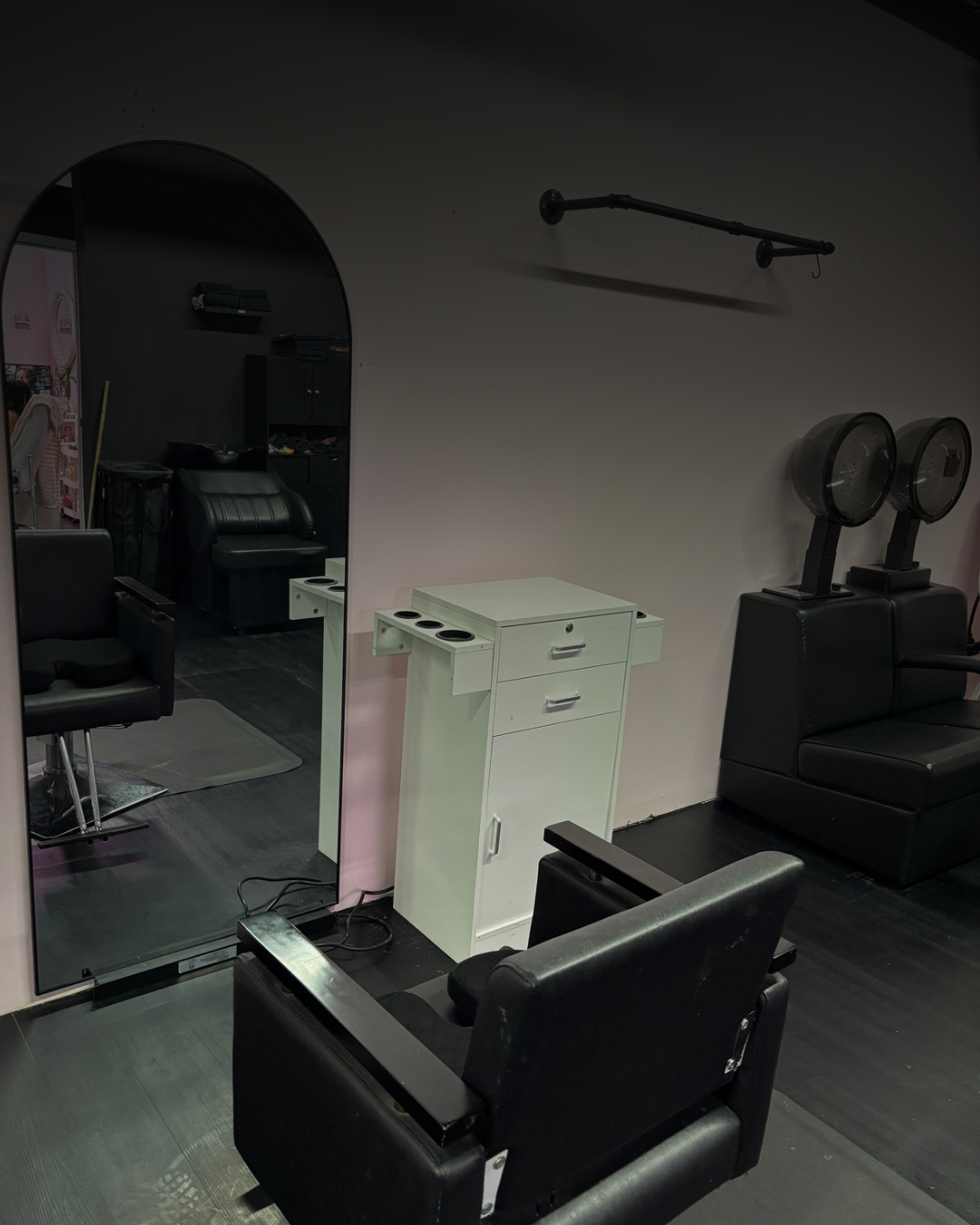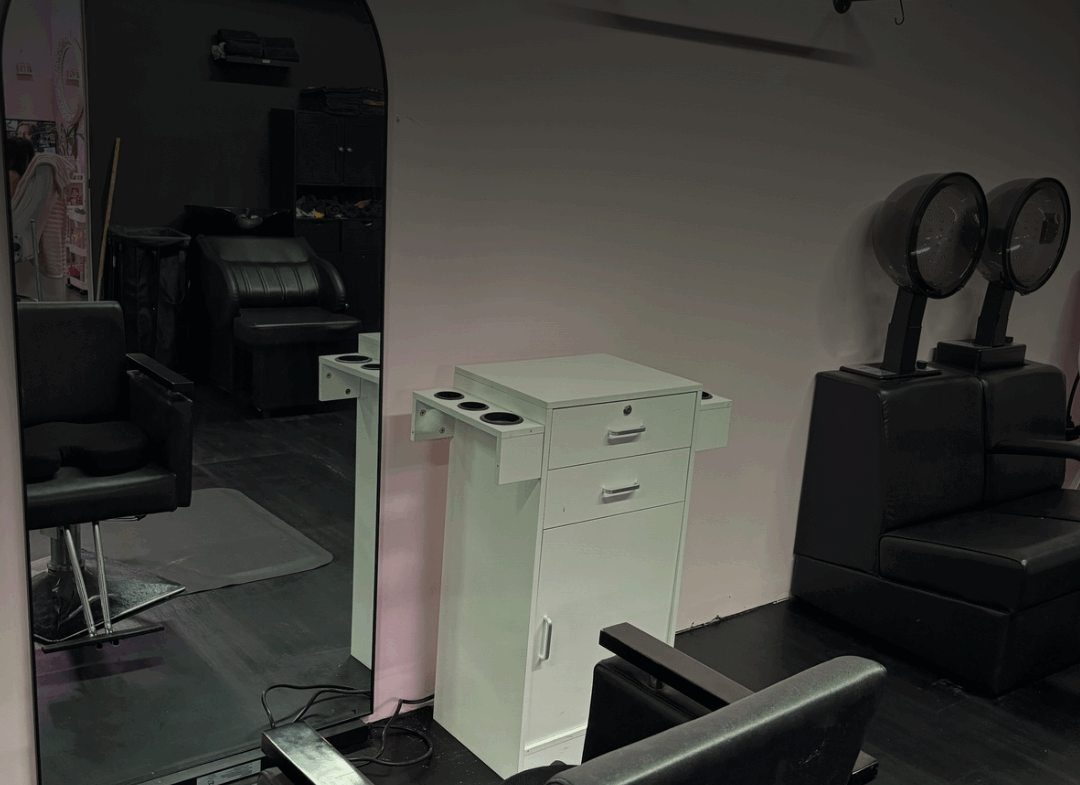 These are private rooms and a hair station available inside a professional salon space, perfect for estheticians, cosmetologists, barbers, lash artists, or massage therapists.